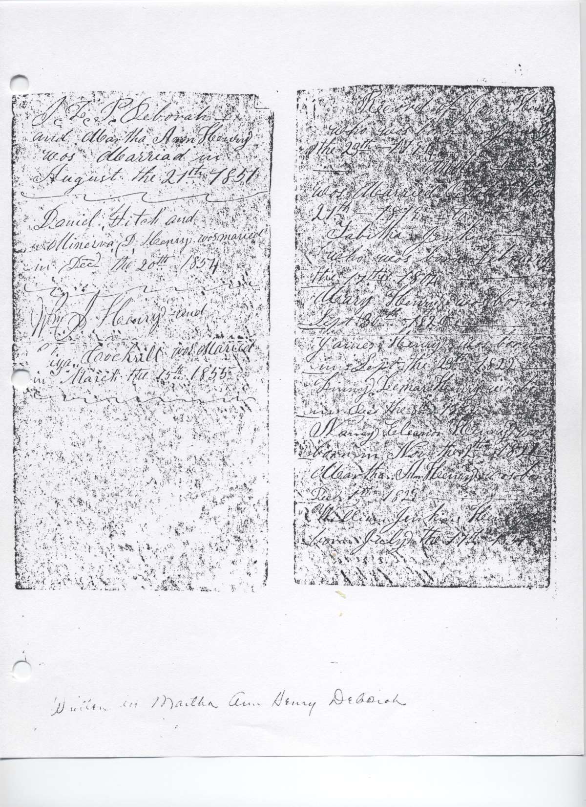- [S192] obtained from Linda Taylor (ggggranddaughter of Martha Ann Henry Deborah), Henry, Minerva and Daniel Fitch - Family Group Sheet (xerox copy.)