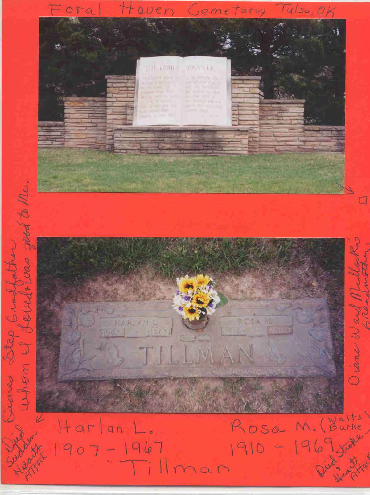 Hi Thanks for answering me. My Grandmother Rosa Mary Burke was married the first time to Henry Edward Walts on Aug 7, 1926 Henry died Jan 26. 1949 my Mother Rosa Marie Walts Ward was only 17 years old when her father died. Not real long after he died after a very long illness of Tuberculois Rosa Mary Burke Walts married for the second to Harlan Tillman. my Mother married my father Clyde Donald Ward June of the same year 1949.. So when I was born April 3, 1953 Harlan Tillman became a Grandfather to me He was not bloodly related but I still consider him my Grandfather who treated me as his own.. I still have the best memories of him and my grandmother they took me fishing and on hiking and picnics and I loved to work with him in his gararge behind there house he had a rebuilt battery shop but he also worked on cars. He had a pet skuck That really impressed me. He always bought me a pop and a candy bar. I also thought of him as a very sensitive loving man. I looked up to him and LOVED him very much... He died very sudden. of a heart attack my Grandmother had had alot of things going on with her health and his kids had caused him alot of stress. I guess he let it bother him to much.. I wish I could have gown to know him even better later in life but I guess God called him home..before we were all ready... My grandmother is burried with him in Tulsa in the Floral Haven Cemetery I will send you a picture of his grave... and More I have a bunch of pictures of alot of the Tillman children... I have been looking for Harlan on the census but had no luck but you helped me to find it I thank you .... A little about myself I am married to a Pat Medlock and will be married 29 years in Oct. and we have two children Kristen 26 and Melissa 24. Our girls live in Dallas Tx and we live in Owasso, Ok ..I will celebrate my 50th birhday in April. Now tell me alittle about your self.. Were do you live? and How old are you? ect. Well dare if you don't want to you don't have to tell your age...Ha Ha... Did you know Betty and Frankie Tillman I remember Frankie I thought he was the best looking Man I ever saw I heard he Committed Suicide did you know that ... My mother had a girl call there house looking for her father who was Frankie she had never seen him she was a beautiful girl my mother gave her pictures of him and that ment a lot to her... I was sad for her she wanted to met her father and thought he was still alive this was a long time ago.. I was thinking How many children did Harlan have all together and was he married more than once before my grandmother in 1949 On the 1930 census he is married to a Norwegin Women My mother remembered her... I guess they had gotten Divoriced. Well its late and my eyes are heavy I had better Go for now Please write back.. THanks God Bless You... Susan Diane Ward Medlock PS this first page all of these items were in his billfold when he died he was a taxi driver at one time. and a card was from his garage called Earls Garage I think that he was in bussiness with another person named Earl I will ask my mother to confirm that.. Hope I made since to you and thanks again.2